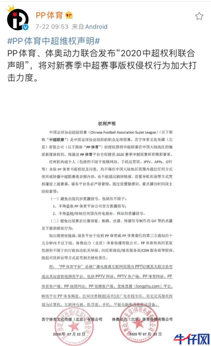 7月22日,PP體育、體奧動力聯(lián)合發(fā)布“2020中超權利聯(lián)合聲明”:任何機構或個人未經PP體育書面授權及同意,均不得在中國大陸地區(qū)范圍內通過任何方式使用或轉播中超聯(lián)賽視音頻內容,也不能通過跳轉鏈接、設置導航頁面等方式變相播放上述賽事。如出現(xiàn)侵權行為,體奧動力、PP體育將共同采取包括但不限于向行政執(zhí)法機關舉報、向應用商店/域名服務商/CDN服務商等投訴、提起司法訴訟等方式追究相關侵權責任。