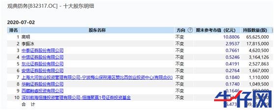 資料顯示,中泰證券(行情600918,診股)持有觀典防務(wù)462.05萬股,中信證券(行情600030,診股)和東北證券(行情000686,診股)則分別持有316.41萬股和252.79萬股。
