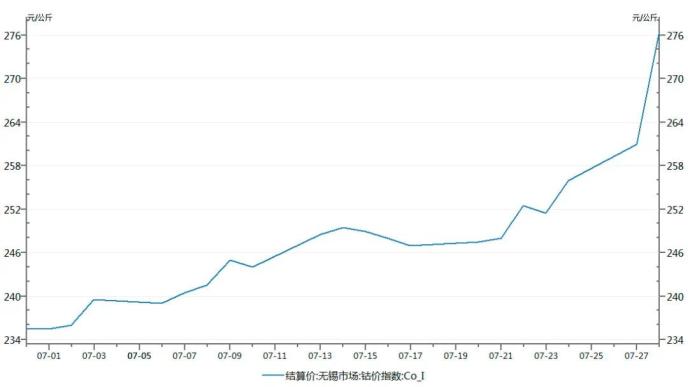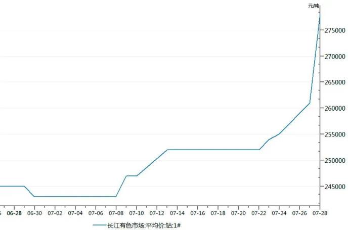 長江有色金屬網數據顯示,金屬鈷7月28日現貨報價為27.8萬元/噸,較前一日上調1.7萬元/噸。目前,金屬鈷的報價已較月初上漲逾14.4%。