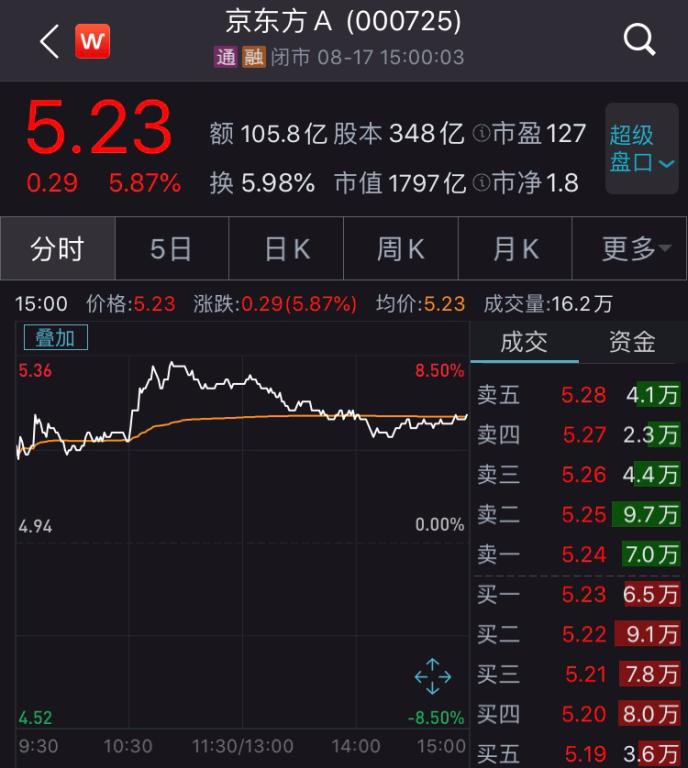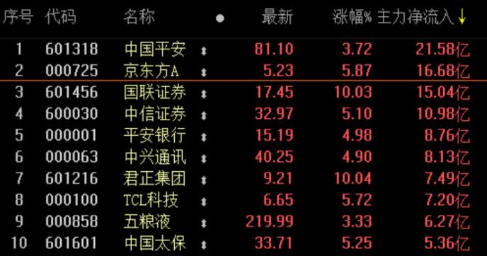 數(shù)據(jù)顯示,時隔一個多月,京東方A單日成交額再次破百億,達到106億元;TCL科技成交額接近40億元。兩家公司均獲主力資金加持,京東方A主力凈流入16.68億元,僅次于中國平安(行情601318,診股);TCL科技主力凈流入7.20億元,排名第8。