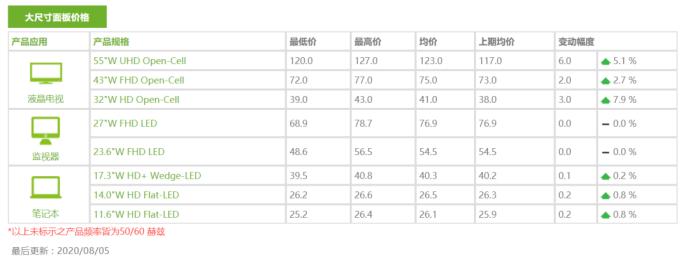 多家市調(diào)機構(gòu)發(fā)布的8月上旬面板報價顯示,受供需格局持續(xù)改善推動,TV面板漲價趨勢依舊。