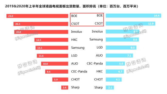 群智咨詢指出,受益于產(chǎn)能增長和韓廠退出,今年上半年,中國內(nèi)地面板廠商的出貨數(shù)量在全球的市場份額較去年同期上升了9.3個百分點至55.5%,出貨面積的市場份額上升11.9個百分點至59%。上半年京東方和TCL科技旗下TCL華星分列全球LCD TV面板出貨數(shù)量和出貨面積的前兩名。集邦咨詢預(yù)計,今年全年中國內(nèi)地面板廠商的出貨占比將躍升至57%。