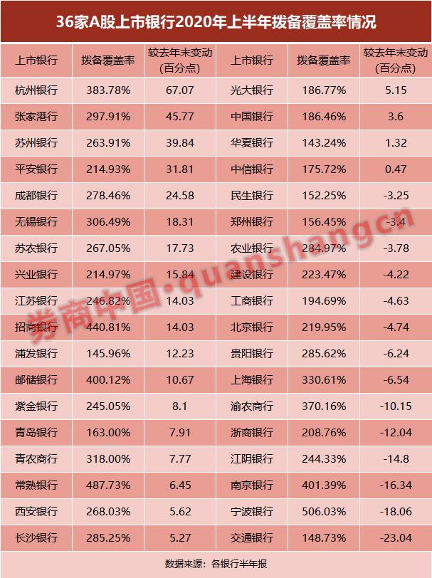 在36家上市銀行中,有22家的撥備覆蓋率比年初提高,12家銀行撥備覆蓋率的上升幅度超過10%。杭州銀行撥備覆蓋力度最大,較年初提升67.07個百分點至383.78%,張家港農(nóng)商行提升45.77個百分點至297.91%。寧波銀行撥備覆蓋率雖下降,但作為城商行中的業(yè)績優(yōu)等生,其撥備覆蓋率已經(jīng)高達506.02%。