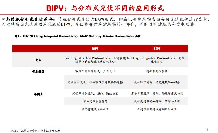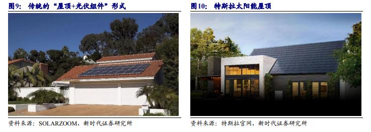 與傳統(tǒng)分布式光伏為BAPV形式(在已有建筑物表面安裝光伏組件進(jìn)行發(fā)電)不同,以特斯拉光伏屋頂為代表的BIPV,光伏本身作為建筑物的一部分,同時(shí)具有建筑物和發(fā)電功能。