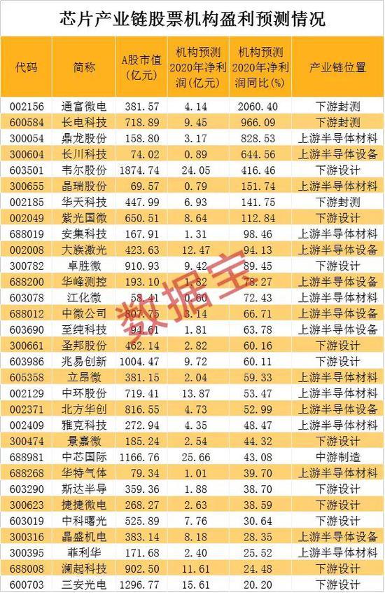 在近一個月時間里,機構陸續調研13家芯片產業鏈股票,機構參與調研家數最多的是立昂微,共有129家。而從5家以上機構一致預測數據來看,部分芯片產業鏈股票全年業績值得期待。數據顯示,31股今年凈利潤獲機構預測增幅在20%以上,預測增幅最高的前五位依次是通富微電、長電科技、鼎龍股份(行情300054,診股)、長川科技(行情300604,診股)、韋爾股份(行情603501,診股)。通富微電獲機構預測凈利潤增幅最高,達到20.6倍。