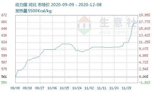 根據生意社數據,動力煤近期漲幅較大,近一周時間內,河北市場上的動力煤均價漲幅高達6.21%,且漲價勢頭不減。在期貨市場,動力煤主力合約2101開盤于701元/噸,最高價714元/噸,收盤于693.6元/噸,較上一交易日上漲0.73%。